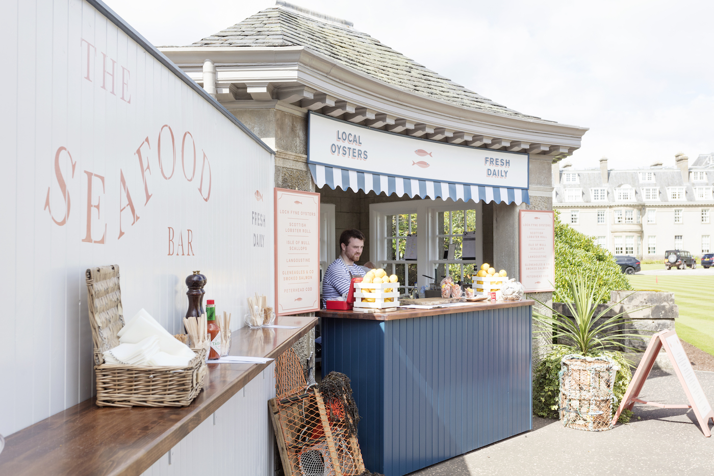 Guests can take their catch out on to the gardens for a stroll, while those looking to truly indulge can soak up the late summer sunshine at one of the mint-green tables, feasting on a classic seafood platter alongside a glass – or perhaps a cheeky bottle – of chilled bubbles.