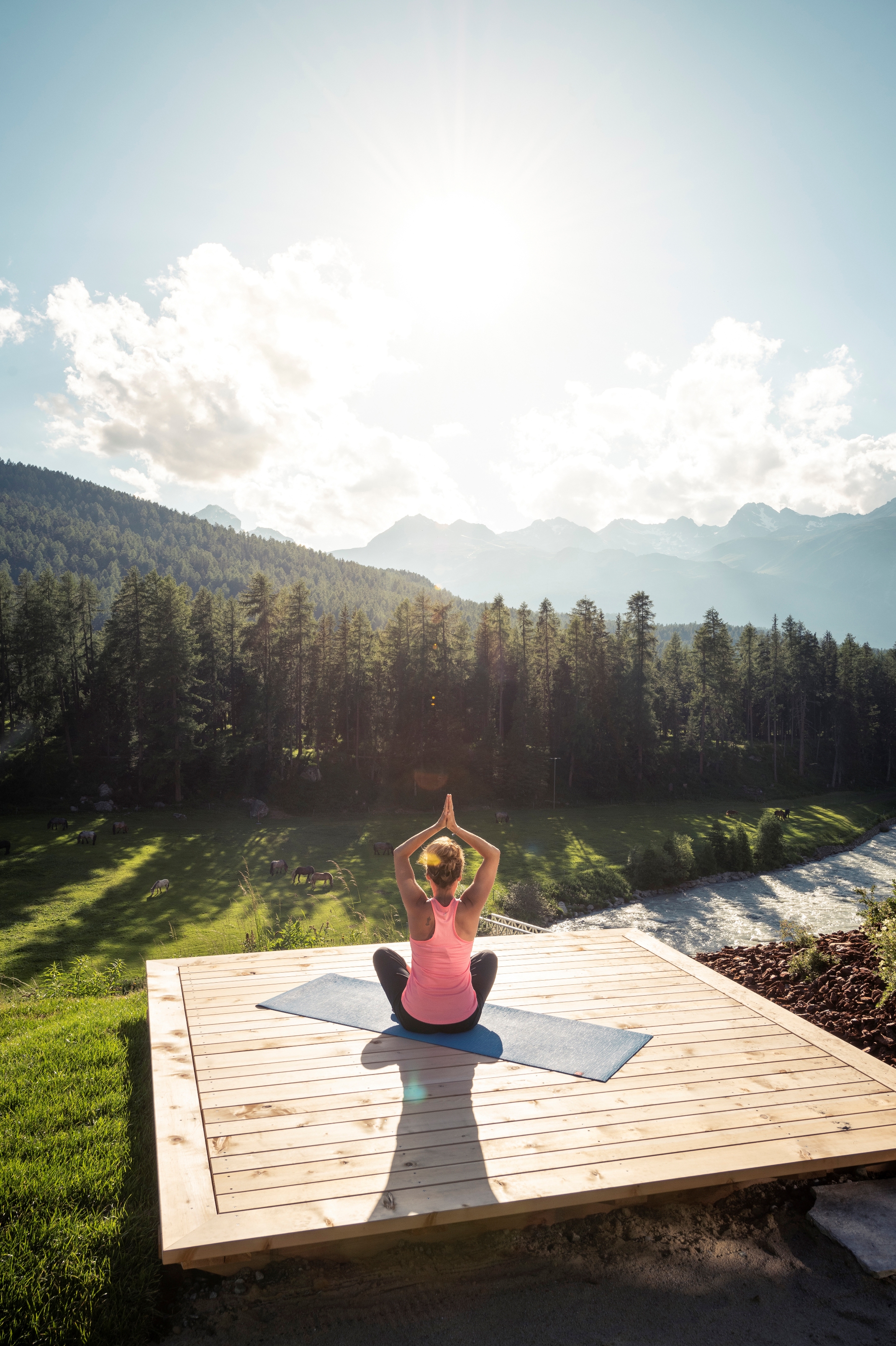 The late afternoon Yin Yoga sessions with Meditation start at 5:00pm, so that participants can witness the “golden hour” with the slow setting of the sun and, weather dependent, a local phenomenon called the ‘Maloja snake’, a stream of wispy white clouds that float through the valley; a super relaxing way to end the day.